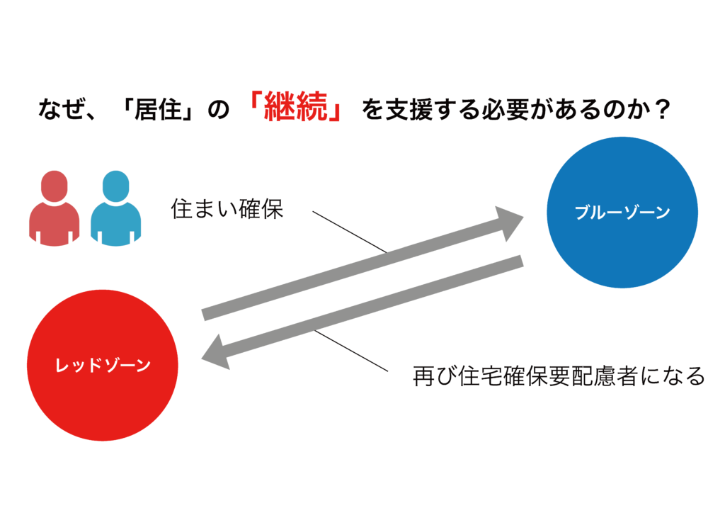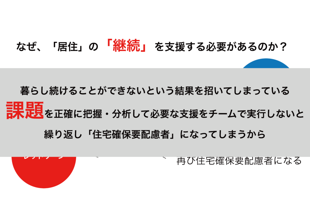 上図は実際に私が発表に活用したスライドの1ページであるが、困っている方がレッドゾーンにいるとした場合、住まいを確保することさえできれば、一時的であれとりあえずブルーゾーンには移行される。ただ、先に述べた「住み続けられない何かしらの問題」が解消されていない限り、また同様の問題が原因となり「住まいを失う」ことになる。そのため、下記に示した通り、「暮らし続けることができないという結果を招いてしまっている課題を正確に把握・分析して必要な支援をチームで実行する」ことが極めて重要になるのである。