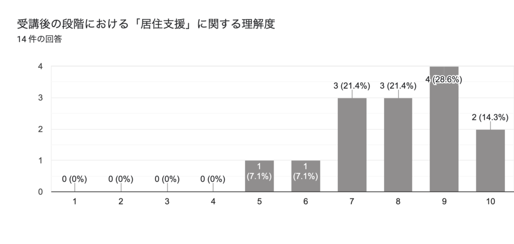 最後に、アンケートについて触れてみたいと思います。さまざまな感想や質問をいただき、感激するばかりですが、全て紹介するわけにもいきませんので、受講前後の理解度についてご紹介します。今回のアンケートでは、「居住支援に関する理解度」について受講前後で10段階評価していただきました。1が低く、10が高いという設定です。すると、受講前の平均値が5.00だったものが、受講後には平均値が8.00へと大きく上昇したのです。勉強会の講師を担った身としては、これ以上嬉しいことはありません。
